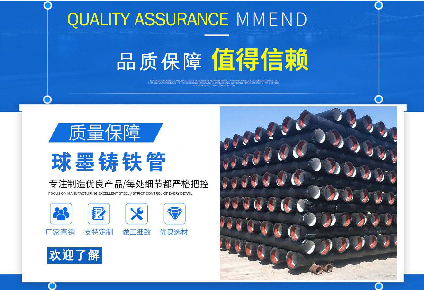 山西飛翔鑄業有限公司是一家以新興技術致力于研制開發、生產、銷售、施工安裝各種球墨管廠家,球墨鑄鐵管價格,國標球墨管,k9球墨鑄鐵管,國標球墨鑄鐵管,離心球墨鑄鐵管等系列鑄鐵產品。公司擁有完善的銷售、售后服務體系及一支由鑄造專家、工程師組成的精通產品設備和生產鑄造的技術力量隊伍。隨著企業的發展,我們積累了豐富的鑄造經驗與科技水平。使得產品具有高強度、高韌性、耐腐蝕性強等性能。同時,我們獲得質量管理體系認證、產品質量認證、職業健康體系認證、環境管理體系認證。產品暢銷各地并打入韓國、新加坡等東南亞市場。 在未來的發展中,公司奉行誠信共雙贏,合作創盛世的企業理念。讓我們一起共創美好未來! 公司產品采用良好的工藝流程,以確保產品質量的穩定性:以良好的設備,確保質量的可靠性。廣泛應用于國內外城市的市政建設,通信,自來水,消防,園林,環保等行業,產品大獲贊譽! 我們有多年的井蓋生產經驗,多名老技術工人有將近二十年的生產經驗,還聘請多名新技術研發人員,因為我們始終堅信質量才是未來生存的根本,只有把質量保證了,企業才會有更加美好的未來。公司堅持用心服務,誠信為本,與時俱進,科技為先的企業理念,堅持科技先導、竭誠為廣大用戶服務。歡迎各界朋友蒞臨我公司參觀,指導洽談業務,相信選擇我們就是選擇我們共贏的明天...